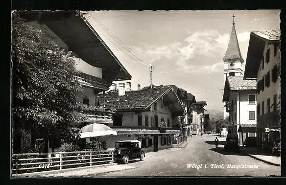 AK Wörgl, Hauptstrasse mit Kirche und Auto