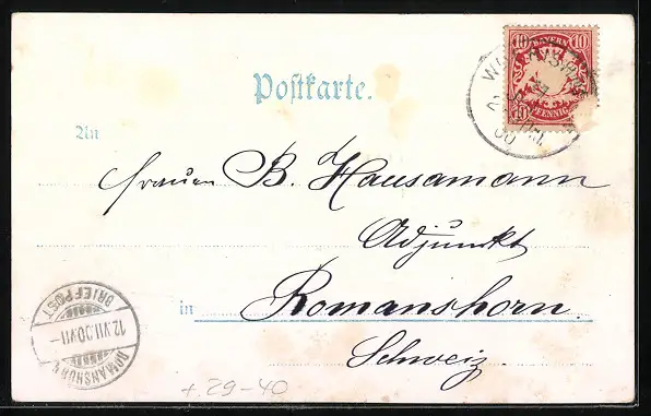 alte Ansichtskarte, gelaufen 1900, Briefmarke entfernt, rückseitig Oberflächenschaden, minimaler Einriss unten mittig, guter Zustand