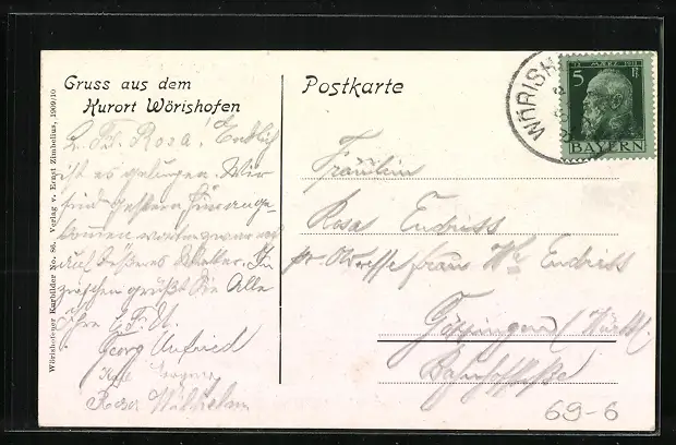 Personenbezogene Daten auf der Rückseite der Karte wurden durch blauen Textmarker unkenntlich gemacht. Die blauen Stellen sind auf die Vorderseite durchgeweicht und wirken sich negativ auf das Postkartenfoto aus