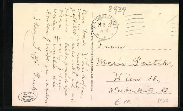 Personenbezogene Daten auf der Rückseite der Karte wurden durch blauen Textmarker unkenntlich gemacht. Die blauen Stellen sind auf die Vorderseite durchgeweicht und wirken sich negativ auf das Postkartenfoto aus