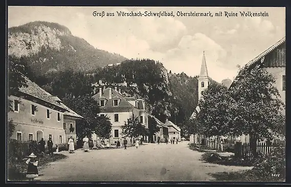 AK Wörschach, Strassenpartie mit Blick auf Kirche und Ruine Wolkenstein