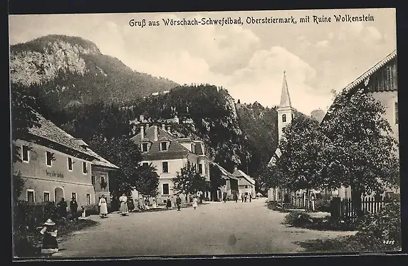 AK Wörschach, Strassenpartie mit Ruine Wolkenstein