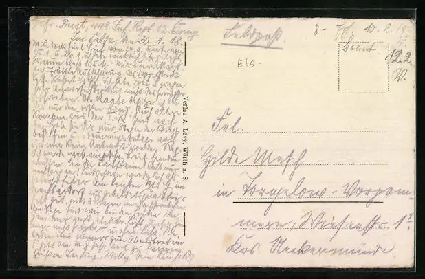 Personenbezogene Daten auf der Rückseite der Karte wurden durch blauen Textmarker unkenntlich gemacht. Die blauen Stellen sind auf die Vorderseite durchgeweicht und wirken sich negativ auf das Postkartenfoto aus