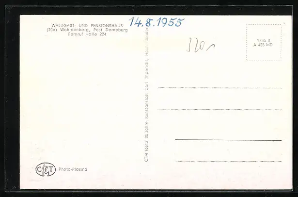 Personenbezogene Daten auf der Rückseite der Karte wurden durch blauen Textmarker unkenntlich gemacht. Die blauen Stellen sind auf die Vorderseite durchgeweicht und wirken sich negativ auf das Postkartenfoto aus