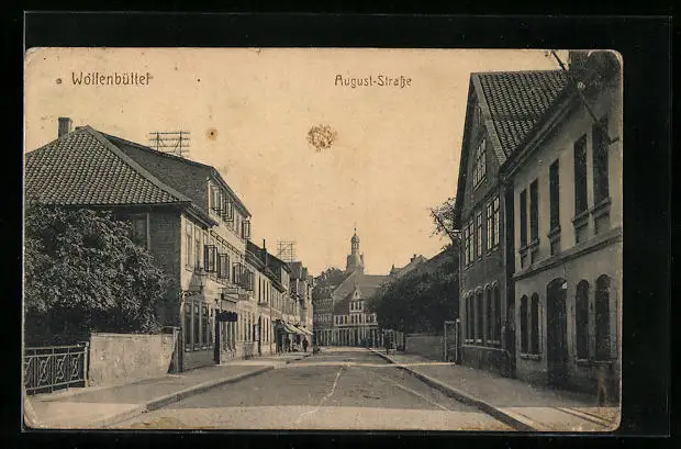AK Wolfenbüttel, August-Strasse mit Kirchturm