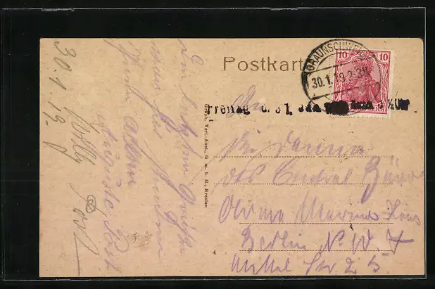Personenbezogene Daten auf der Rückseite der Karte wurden durch blauen Textmarker unkenntlich gemacht. Die blauen Stellen sind auf die Vorderseite durchgeweicht und wirken sich negativ auf das Postkartenfoto aus