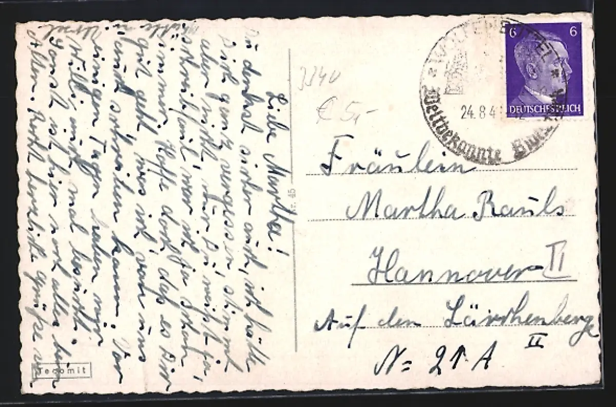 Personenbezogene Daten auf der Rückseite der Karte wurden durch blauen Textmarker unkenntlich gemacht. Die blauen Stellen sind auf die Vorderseite durchgeweicht und wirken sich negativ auf das Postkartenfoto aus
