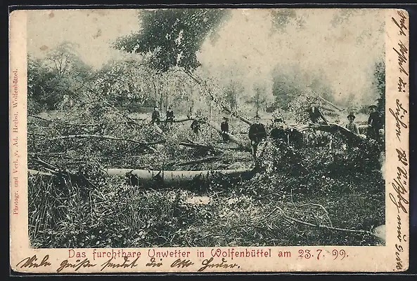 AK Wolfenbüttel, Unwetter 1899, Ortspartie mit umgestürzten Bäumen