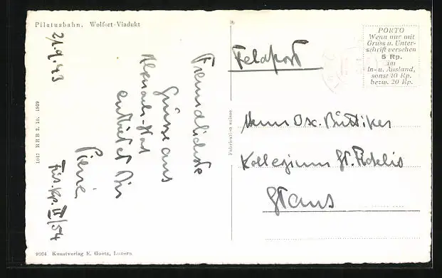 Personenbezogene Daten auf der Rückseite der Karte wurden durch blauen Textmarker unkenntlich gemacht. Die blauen Stellen sind auf die Vorderseite durchgeweicht und wirken sich negativ auf das Postkartenfoto aus