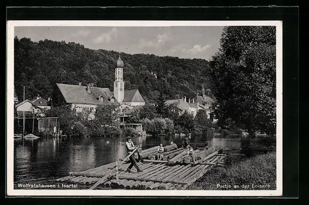 AK Wolfratshausen i. Isartal, Partie an der Loisach mit Flössern, Forstwirtschaft