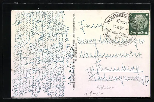 Personenbezogene Daten auf der Rückseite der Karte wurden durch blauen Textmarker unkenntlich gemacht. Die blauen Stellen sind auf die Vorderseite durchgeweicht und wirken sich negativ auf das Postkartenfoto aus