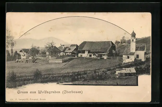 AK Wolfsgruben /Oberbozen, Kirche mit Reetdachbautenn