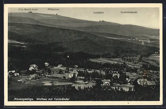 AK Wolfshau, Gesamtansicht des Ortes von oben nach den Teichrändern
