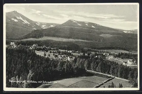 AK Wolfshau, Ortsansicht mit Blick zur Schneekoppe