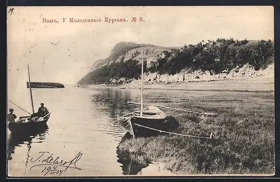 AK Wolga, Boote am Ufer bei Molodetskiy Kurgan