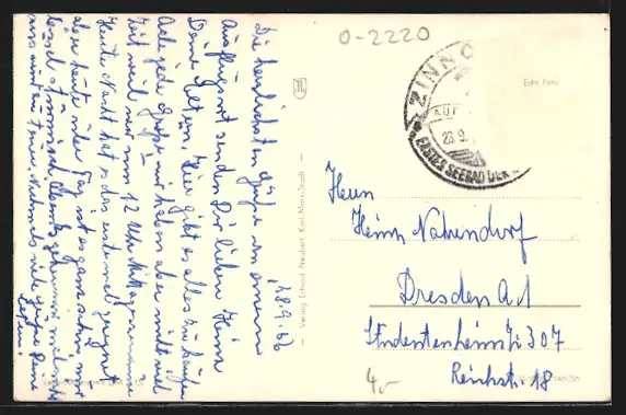 Personenbezogene Daten auf der Rückseite der Karte wurden durch blauen Textmarker unkenntlich gemacht. Die blauen Stellen sind auf die Vorderseite durchgeweicht und wirken sich negativ auf das Postkartenfoto aus