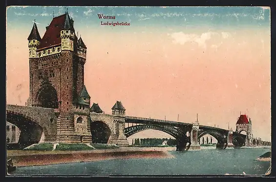 AK Worms, Ludwigsbrücke mit Rhein