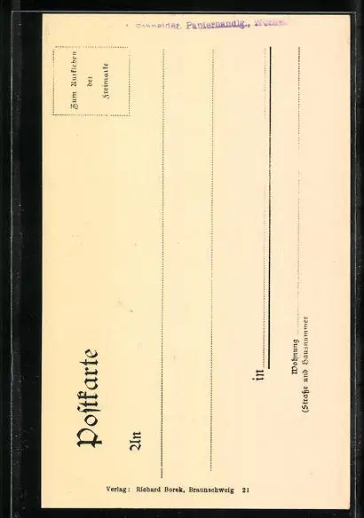 Personenbezogene Daten auf der Rückseite der Karte wurden durch blauen Textmarker unkenntlich gemacht. Die blauen Stellen sind auf die Vorderseite durchgeweicht und wirken sich negativ auf das Postkartenfoto aus