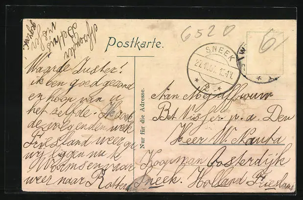 Personenbezogene Daten auf der Rückseite der Karte wurden durch blauen Textmarker unkenntlich gemacht. Die blauen Stellen sind auf die Vorderseite durchgeweicht und wirken sich negativ auf das Postkartenfoto aus