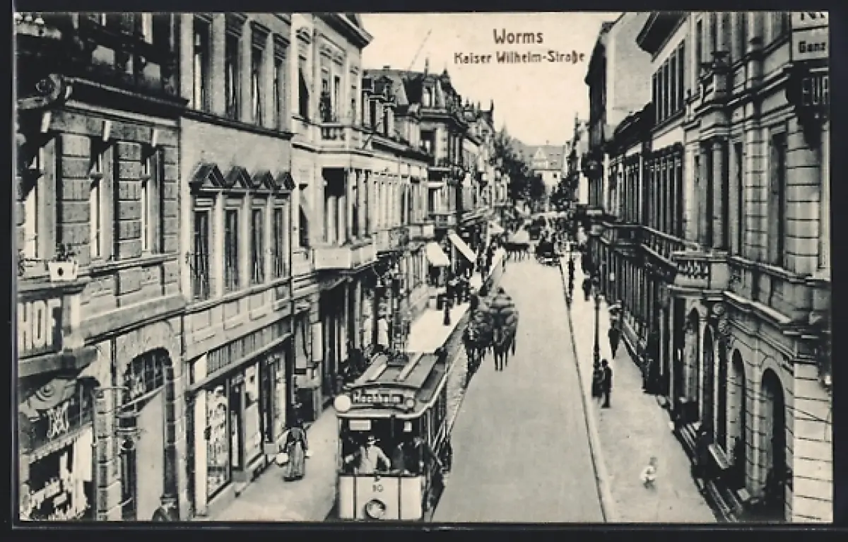AK Worms, Strassenbahn in der Kaiser Wilhelm Strasse mit Geschäften