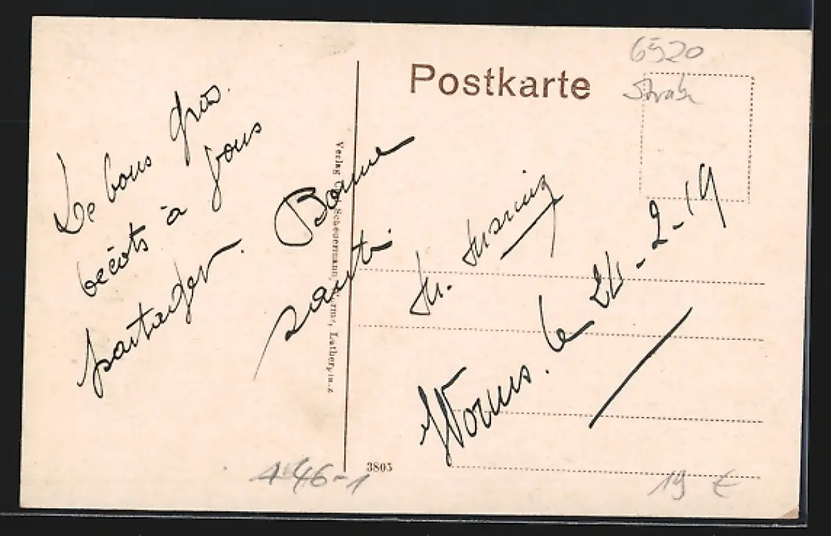 Personenbezogene Daten auf der Rückseite der Karte wurden durch blauen Textmarker unkenntlich gemacht. Die blauen Stellen sind auf die Vorderseite durchgeweicht und wirken sich negativ auf das Postkartenfoto aus