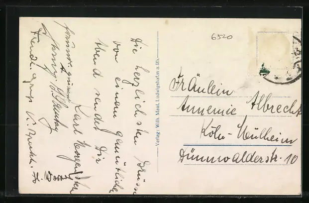 Personenbezogene Daten auf der Rückseite der Karte wurden durch blauen Textmarker unkenntlich gemacht. Die blauen Stellen sind auf die Vorderseite durchgeweicht und wirken sich negativ auf das Postkartenfoto aus