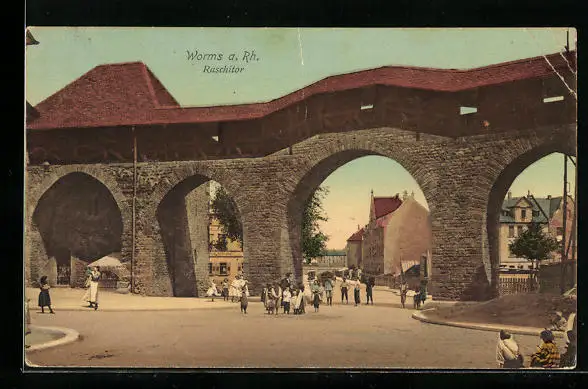 AK Worms a. Rh., Blick auf das Raschitor mit Passanten