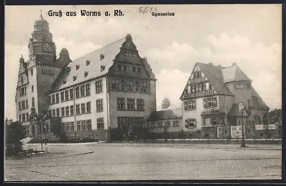 AK Worms a. Rh., Gymnasium mit Strassenpartie