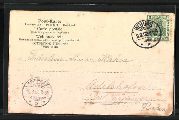 gelaufen 1902, Eckbuge unten, leicht fleckig, guter Zustand