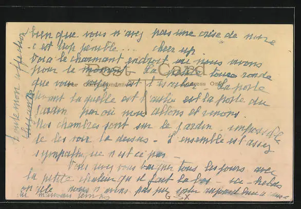 Personenbezogene Daten auf der Rückseite der Karte wurden durch blauen Textmarker unkenntlich gemacht. Die blauen Stellen sind auf die Vorderseite durchgeweicht und wirken sich negativ auf das Postkartenfoto aus
