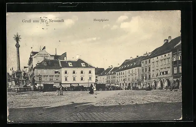 AK Wr. Neustadt, Hauptplatz mit Geschäften und Denkmal