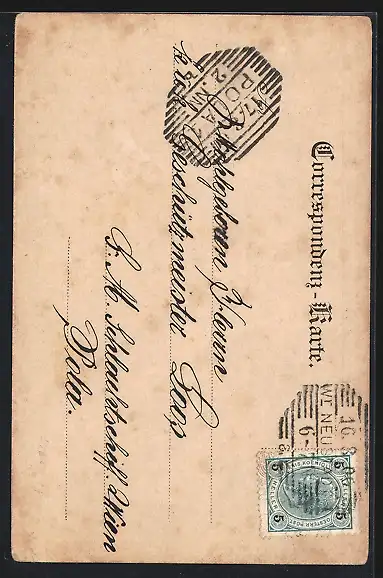 gelaufen 1900, Eckknicke oben li. und unten re., guter Zustand