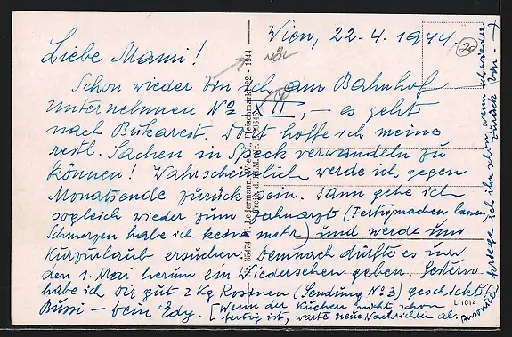Personenbezogene Daten auf der Rückseite der Karte wurden durch blauen Textmarker unkenntlich gemacht. Die blauen Stellen sind auf die Vorderseite durchgeweicht und wirken sich negativ auf das Postkartenfoto aus