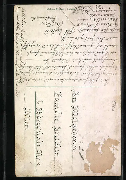 Personenbezogene Daten auf der Rückseite der Karte wurden durch blauen Textmarker unkenntlich gemacht. Die blauen Stellen sind auf die Vorderseite durchgeweicht und wirken sich negativ auf das Postkartenfoto aus