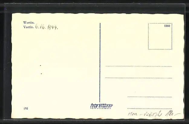 Personenbezogene Daten auf der Rückseite der Karte wurden durch blauen Textmarker unkenntlich gemacht. Die blauen Stellen sind auf die Vorderseite durchgeweicht und wirken sich negativ auf das Postkartenfoto aus
