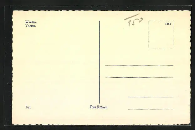 Personenbezogene Daten auf der Rückseite der Karte wurden durch blauen Textmarker unkenntlich gemacht. Die blauen Stellen sind auf die Vorderseite durchgeweicht und wirken sich negativ auf das Postkartenfoto aus