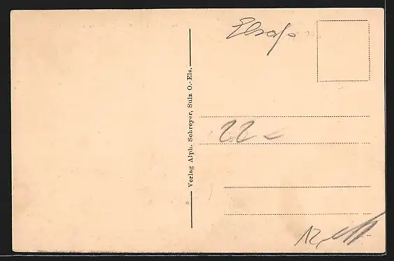 Personenbezogene Daten auf der Rückseite der Karte wurden durch blauen Textmarker unkenntlich gemacht. Die blauen Stellen sind auf die Vorderseite durchgeweicht und wirken sich negativ auf das Postkartenfoto aus