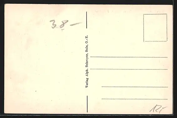 Personenbezogene Daten auf der Rückseite der Karte wurden durch blauen Textmarker unkenntlich gemacht. Die blauen Stellen sind auf die Vorderseite durchgeweicht und wirken sich negativ auf das Postkartenfoto aus