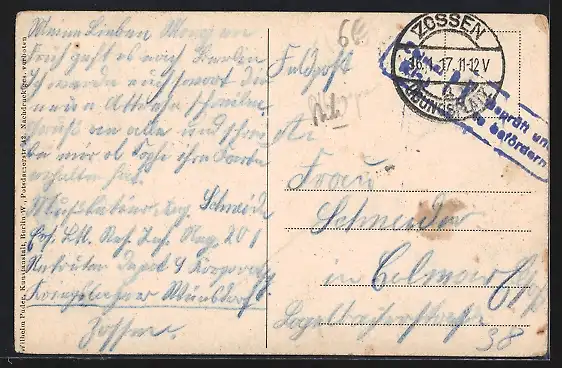 Personenbezogene Daten auf der Rückseite der Karte wurden durch blauen Textmarker unkenntlich gemacht. Die blauen Stellen sind auf die Vorderseite durchgeweicht und wirken sich negativ auf das Postkartenfoto aus
