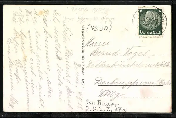 Personenbezogene Daten auf der Rückseite der Karte wurden durch blauen Textmarker unkenntlich gemacht. Die blauen Stellen sind auf die Vorderseite durchgeweicht und wirken sich negativ auf das Postkartenfoto aus
