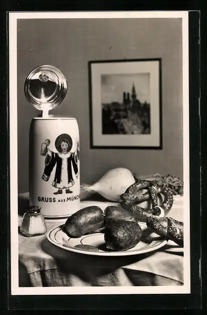 AK Würste, Brezel und Mass Bier mit Münchner Kindl