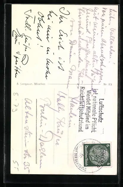 Personenbezogene Daten auf der Rückseite der Karte wurden durch blauen Textmarker unkenntlich gemacht. Die blauen Stellen sind auf die Vorderseite durchgeweicht und wirken sich negativ auf das Postkartenfoto aus