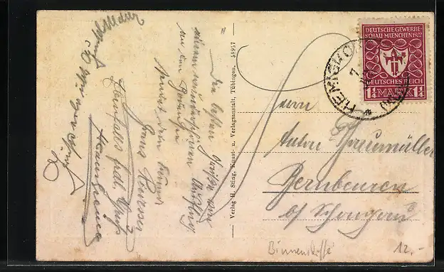 Personenbezogene Daten auf der Rückseite der Karte wurden durch blauen Textmarker unkenntlich gemacht. Die blauen Stellen sind auf die Vorderseite durchgeweicht und wirken sich negativ auf das Postkartenfoto aus