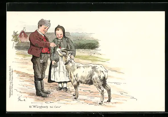 AK Würzbach bei Calw, Kinder in schwäbischen Trachten füttern Ziege