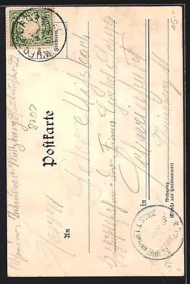 Personenbezogene Daten auf der Rückseite der Karte wurden durch blauen Textmarker unkenntlich gemacht. Die blauen Stellen sind auf die Vorderseite durchgeweicht und wirken sich negativ auf das Postkartenfoto aus