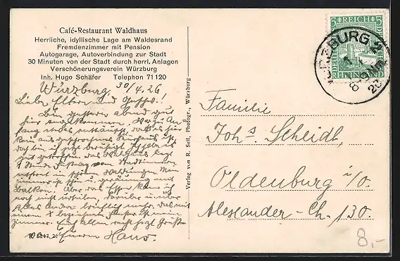 AK Würzburg, Café-Restaurant Waldhaus v. Hugo Schäfer