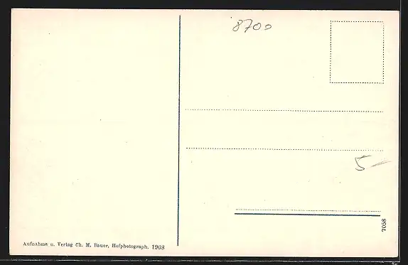Personenbezogene Daten auf der Rückseite der Karte wurden durch blauen Textmarker unkenntlich gemacht. Die blauen Stellen sind auf die Vorderseite durchgeweicht und wirken sich negativ auf das Postkartenfoto aus
