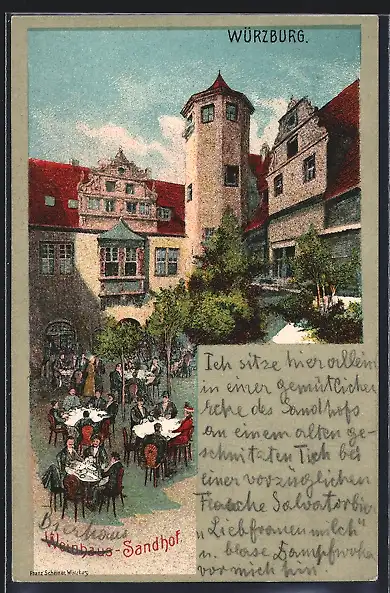 AK Würzburg, Gasthaus Sandhof, Gäste im Innenhof