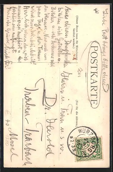Personenbezogene Daten auf der Rückseite der Karte wurden durch blauen Textmarker unkenntlich gemacht. Die blauen Stellen sind auf die Vorderseite durchgeweicht und wirken sich negativ auf das Postkartenfoto aus