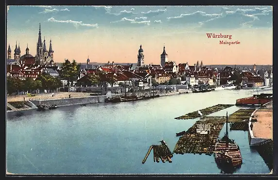 AK Würzburg, Mainpartie mit Flösser, Ortsansicht vom Fluss aus